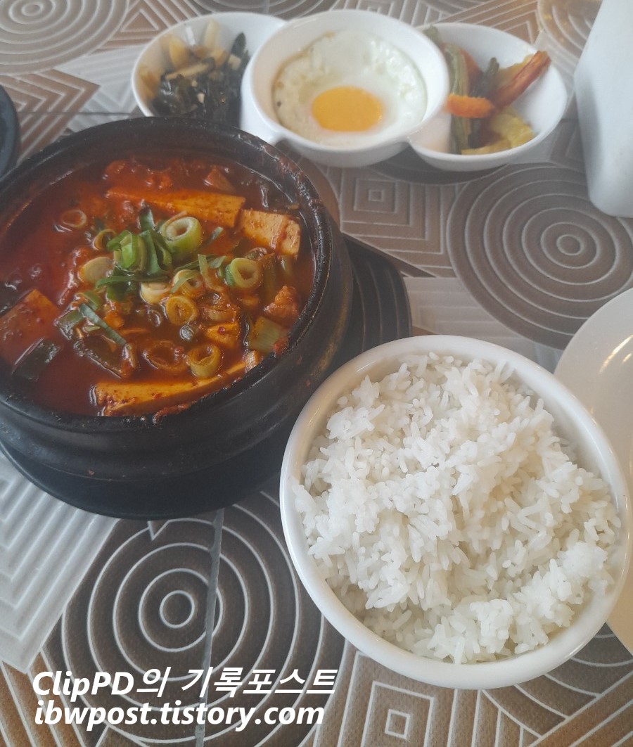 밥, 찌개, 써니사이드 업 프라이 + 반찬 2가지라 줄 수 있는게 찌개 속 돼지고기 밖에 없는 걸 아는건가...